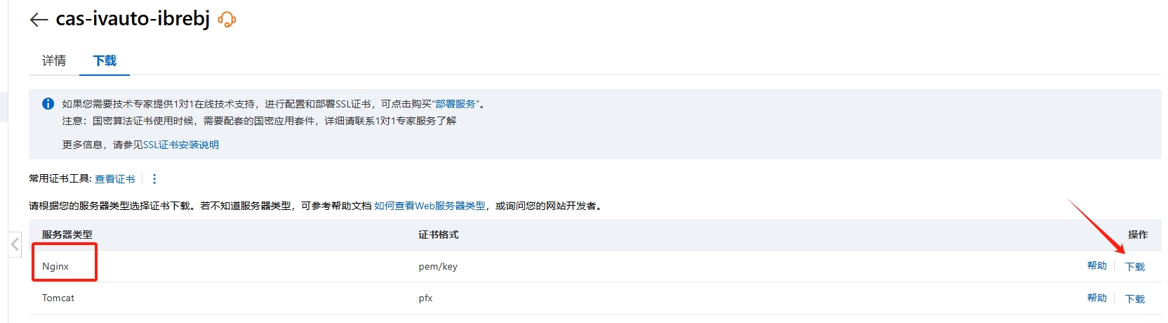 点击【更多】,选择【下载】->【Nginx】,把下载好的证书文件提供给客服进行配置