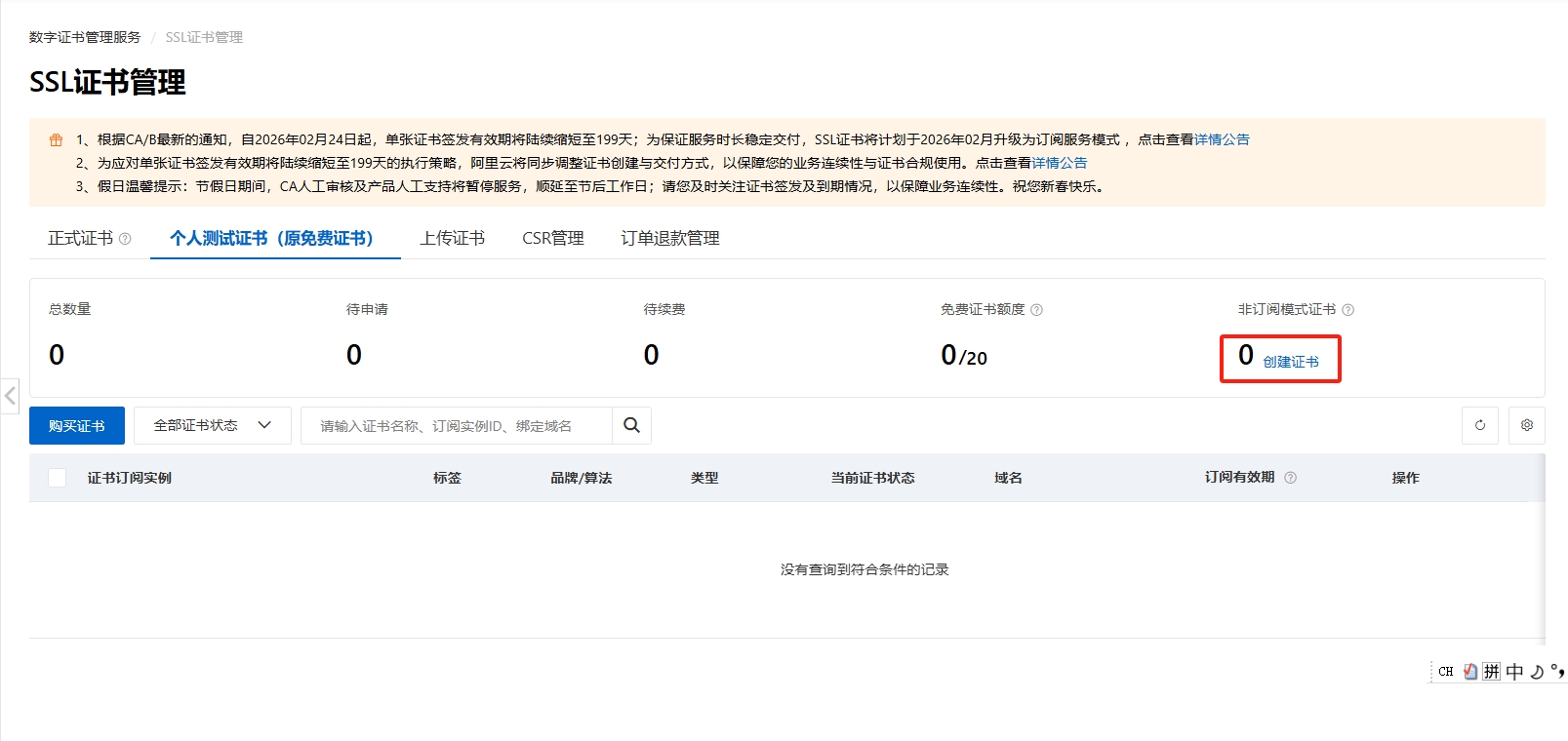 购买后,点击【创建证书】,输入你的域名和信息
