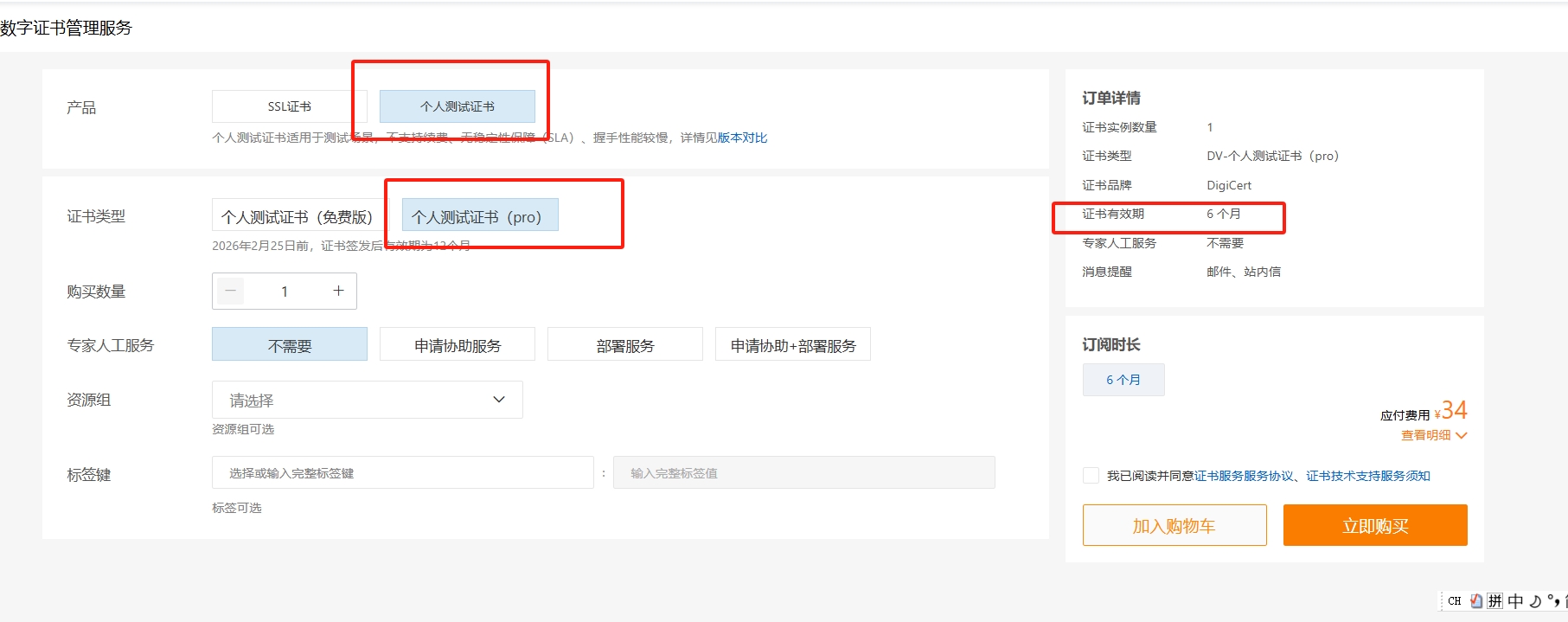 选择【个人测试证书pro】,选择6个月有效期,然后下单购买